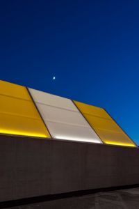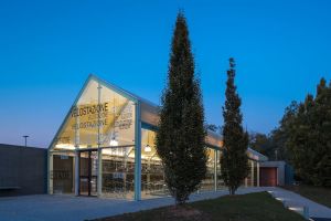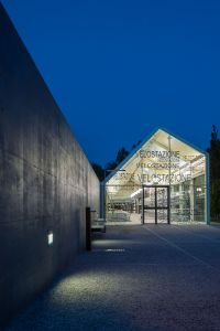 L’architettura, volutamente semplice, è ispirata agli elementi ricorrenti nella consuetudine costruttiva del luogo: murature di confine, volumi elementari, coperture a falde inclinate. Al contempo l’uso di materiali contemporanei, quali il telo di copertura colorato e trasparente, l’impiego esteso di vetrate, la declinazione dei dettagli e il dimensionamento dei volumi permettono di rendere l’edificio adeguato al contesto urbano e alla natura pubblica e di servizio che riveste.