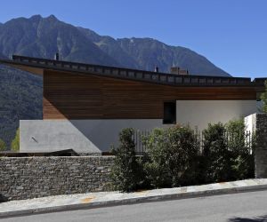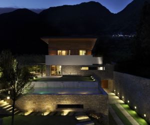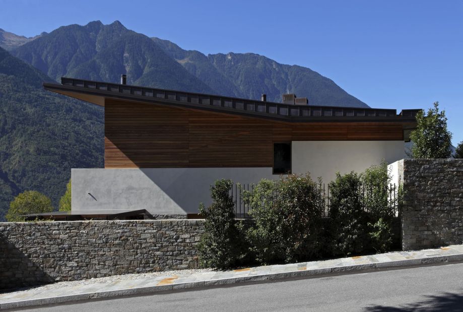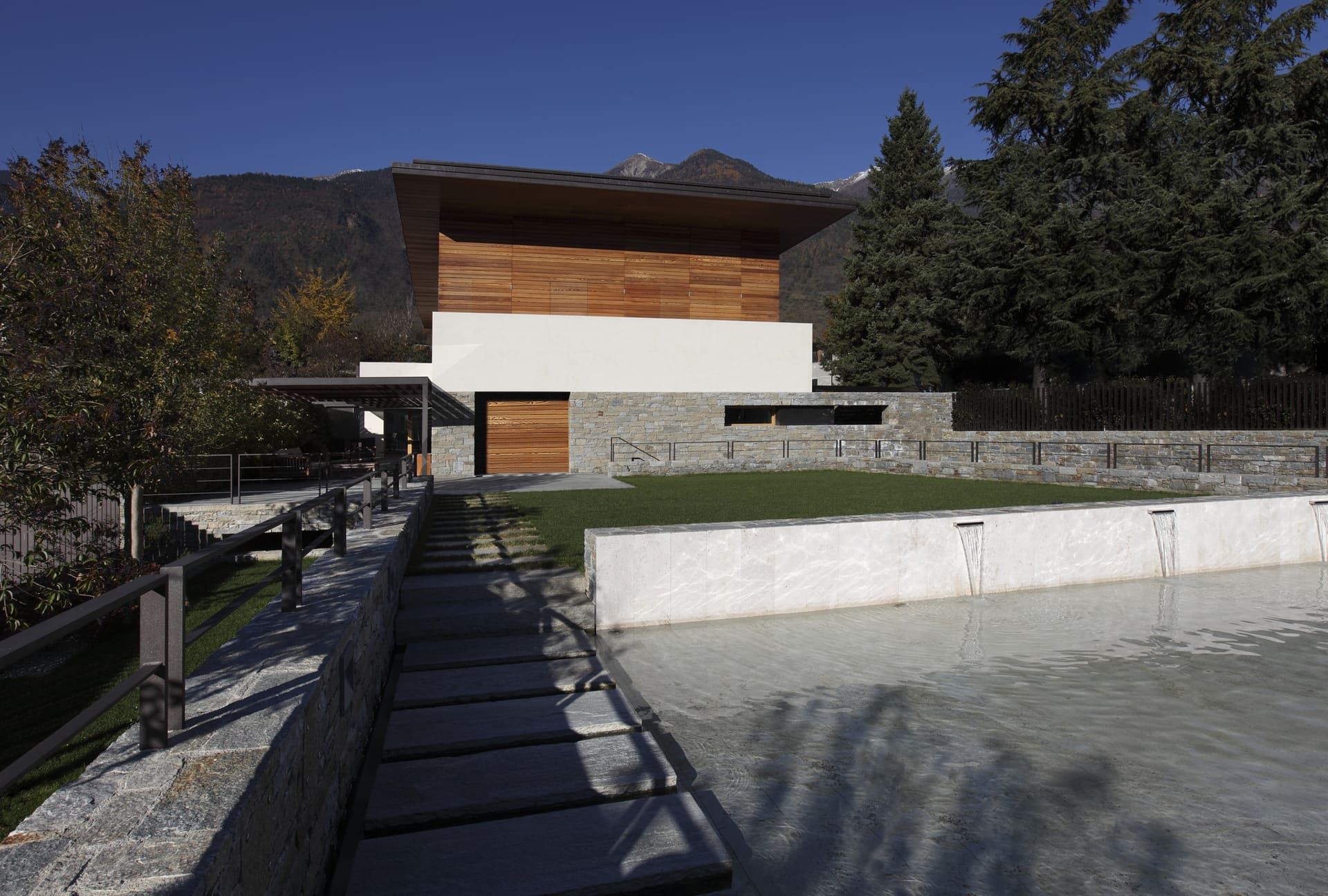 Il linguaggio architettonico interpreta i materiali tipici locali in chiave contemporanea: pietra di rivestimento per i muri dei terrazzi e il basamento dell’abitazione, calce bianca per il piano nobile, legno di larice naturale per il rivestimento del livello superiore destinato al reparto notte e l’intradosso della coperta che si sviluppa elevando la falda verso le cime delle vette antistanti. Particolare attenzione è stata rivolta al controllo della luce: negli spazi seminterrati (piscina spa e taverna) è stata introdotta un’illuminazione zenitale e naturale, mentre le aree di soggiorno all’aperto sono state ombreggiate da pergolati in acciaio, legno-acciaio e legno disposti lungo i fronti est ed ovest. L’edificio, in classe energetica A, adotta energie rinnovabili (pompa di calore geotermica, solare termico) e un sofisticato sistema domotico per il controllo e la gestione degli impianti.