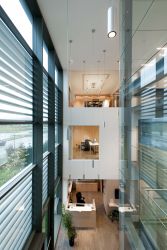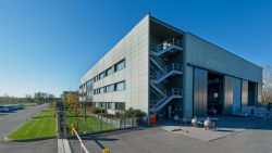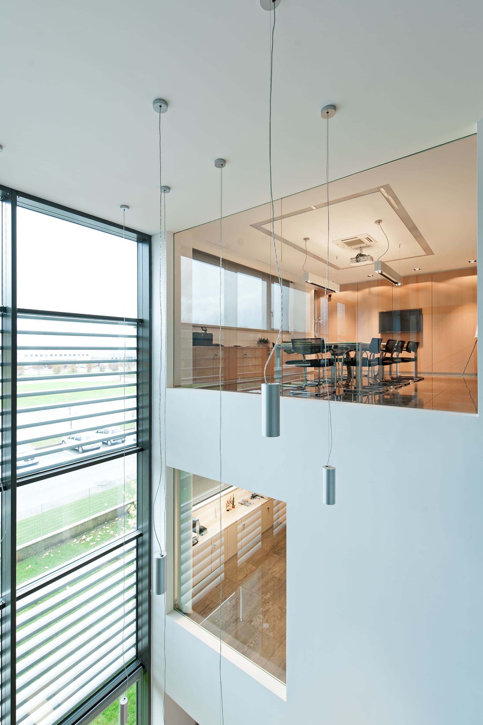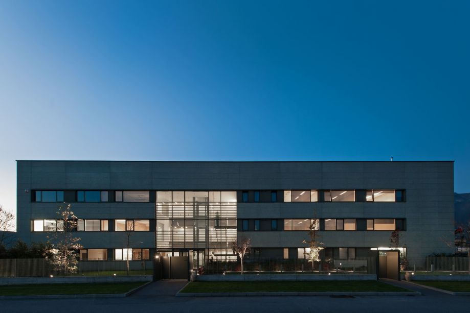 Le norme tecniche del piano attuativo imponevano, per le facciate, l’uso di pannelli prefabbricati in graniglia di cemento. Il disegno architettonico del fronte principale risponde ai vincoli normativi introducendo lunghi nastri orizzontali a cui corrispondono sottili brise soleil sovrapposti alla facciata continua dell’atrio di ingresso. Lo spazio centrale a tripla altezza organizza i sistemi distributivi, la sala riunioni e l’ufficio direzionale.