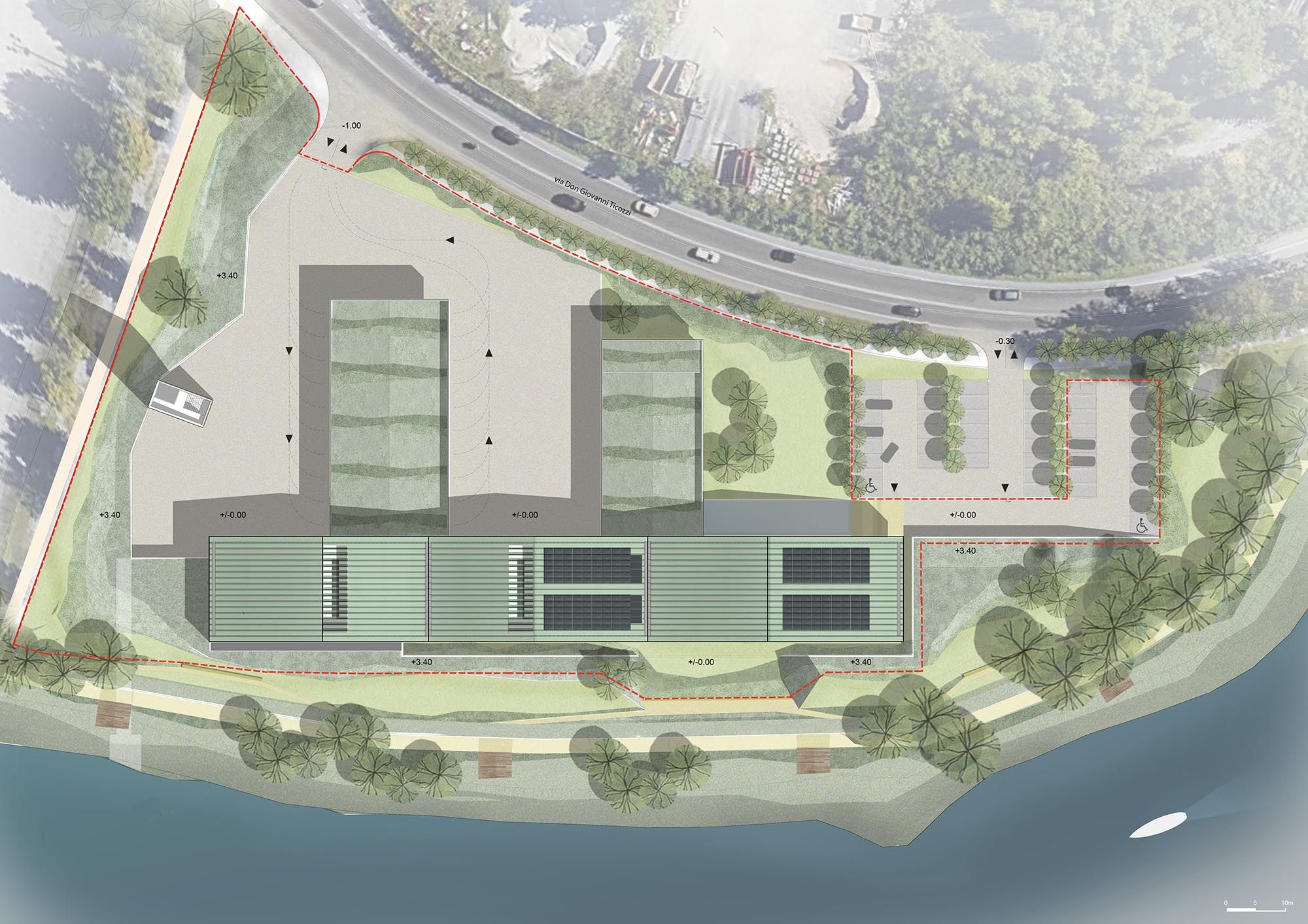 - di mitigare la percezione dell’edificio che viene percepito come un lungo edificio, di un solo piano, adagiato su un pendio naturale e che assume cromie riflessi del contesto lacuale ed evoca il profilo articolato dei rilievi montuosi;