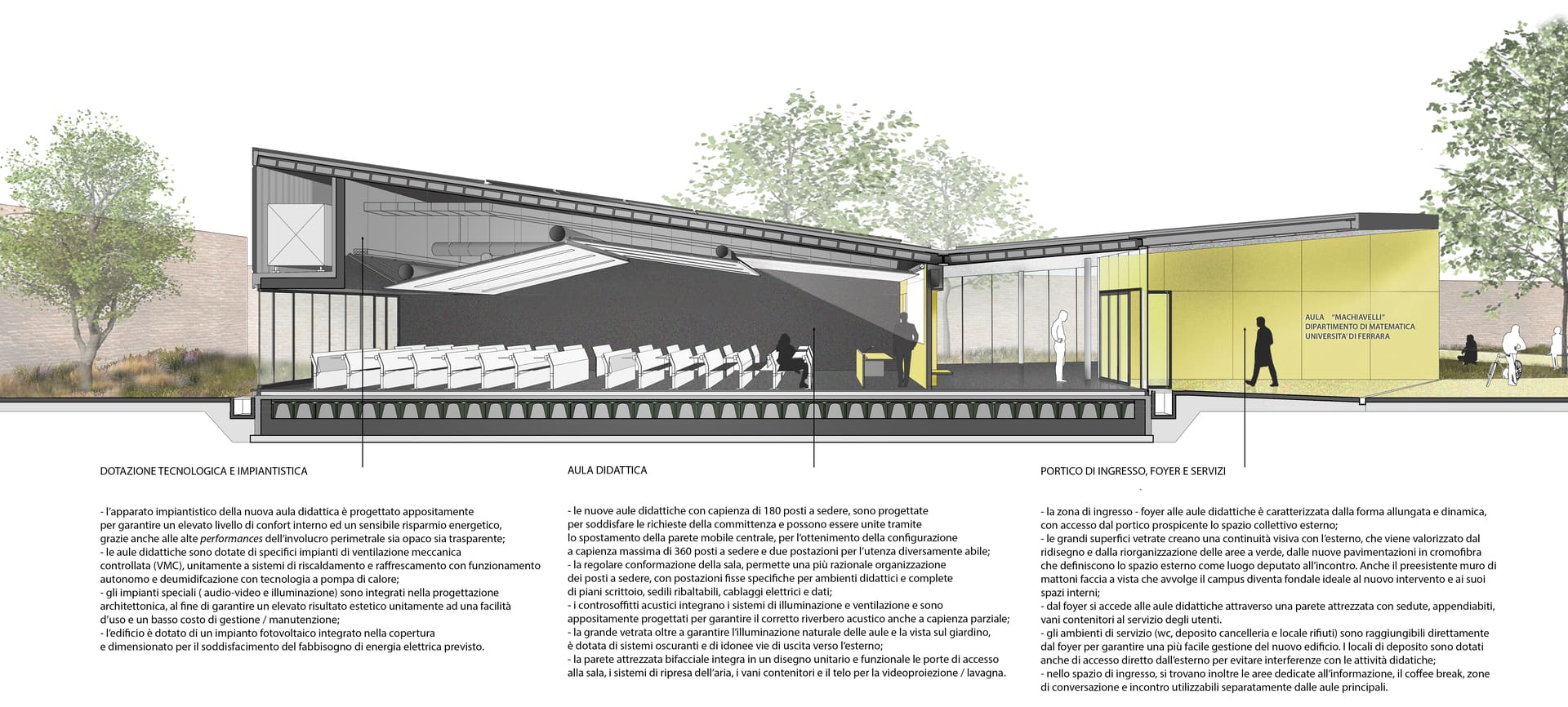 L’edificio proposto s’inserisce nel contesto cittadino esistente con la duplice ambizione di affermare l’identità della funzione universitaria e stabilire un rapporto con il carattere culturale di Ferrara senza rinunciare a testimoniare la contemporaneità dell’intervento.