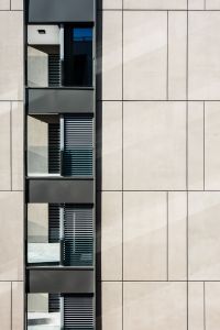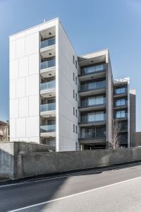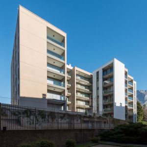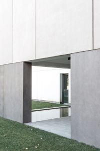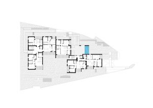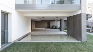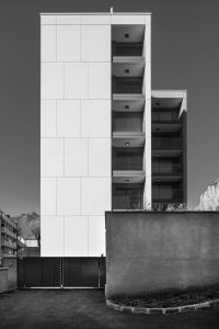 L’edificio si caratterizza quindi per la successione di una serie di diaframmi, paralleli alla Via Don Pozzi, tra i quali sono compresi i profondi terrazzi che contribuiscono a svuotare la massa orientando gli affacci in direzione dei giardini privati adiacenti e delle corone montuose che emergono all’orizzonte.