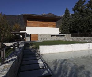 Il linguaggio architettonico interpreta i materiali tipici locali in chiave contemporanea: pietra di rivestimento per i muri dei terrazzi e il basamento dell’abitazione, calce bianca per il piano nobile, legno di larice naturale per il rivestimento del livello superiore destinato al reparto notte e l’intradosso della coperta che si sviluppa elevando la falda verso le cime delle vette antistanti. Particolare attenzione è stata rivolta al controllo della luce: negli spazi seminterrati (piscina spa e taverna) è stata introdotta un’illuminazione zenitale e naturale, mentre le aree di soggiorno all’aperto sono state ombreggiate da pergolati in acciaio, legno-acciaio e legno disposti lungo i fronti est ed ovest. L’edificio, in classe energetica A, adotta energie rinnovabili (pompa di calore geotermica, solare termico) e un sofisticato sistema domotico per il controllo e la gestione degli impianti.