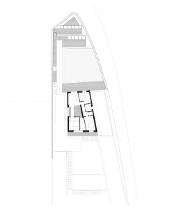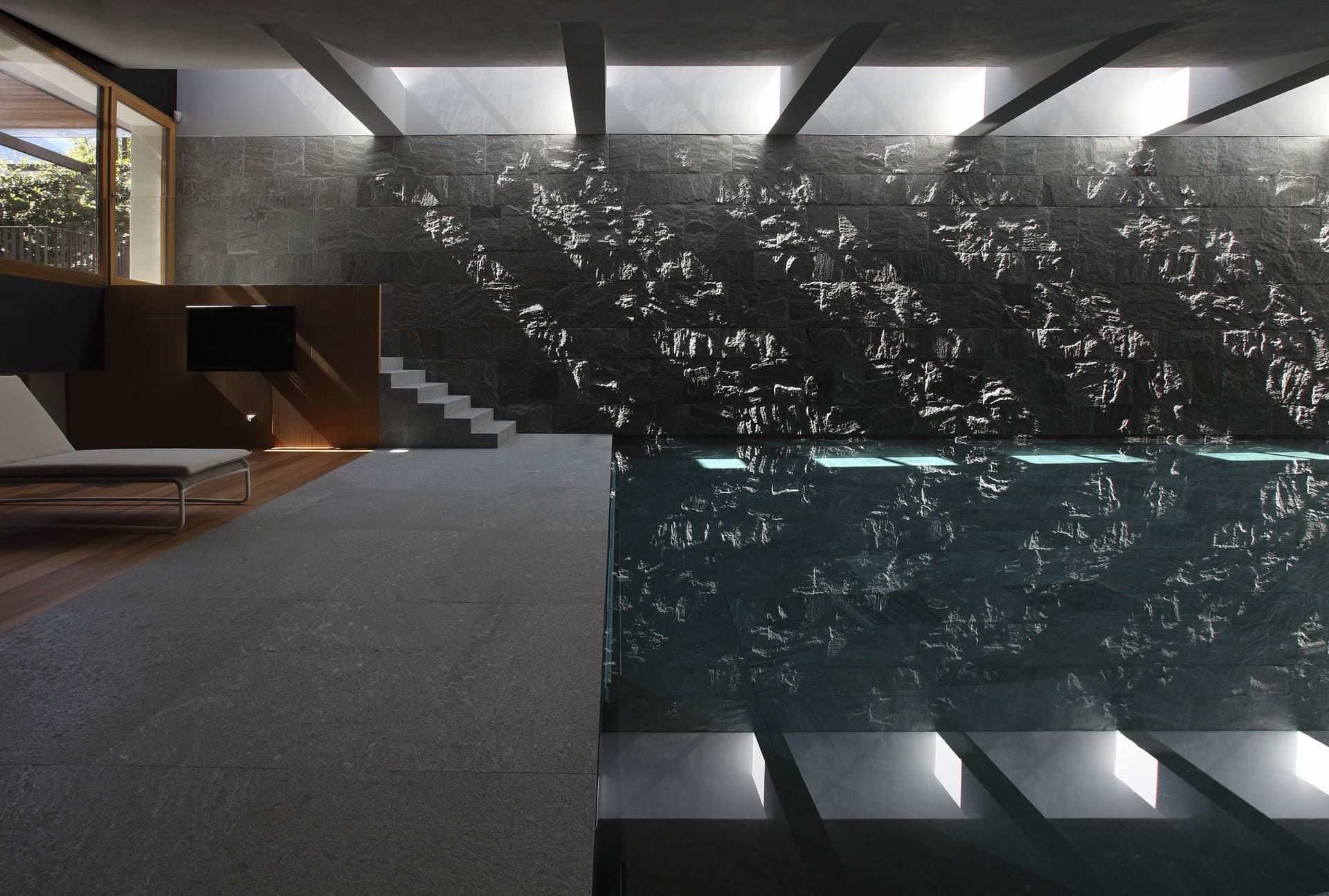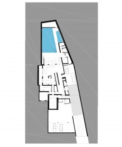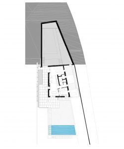 L’idea-guida del progetto è delineata da due “segni”: la geometria allungata e degradante del lotto e la preesistenza di un grande vuoto centrale corrispondente ad un deposito interrato. Queste premesse fondamentali hanno suggerito di collocare buona parte delle funzioni previste – piscina spa, taverna, locali tecnici e di servizio – a livello seminterrato sfruttando l’orografia degradante del terreno.