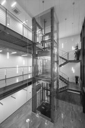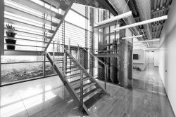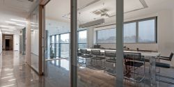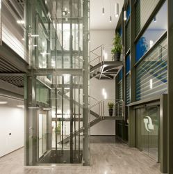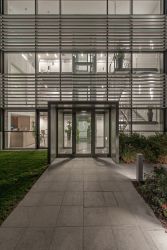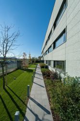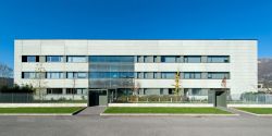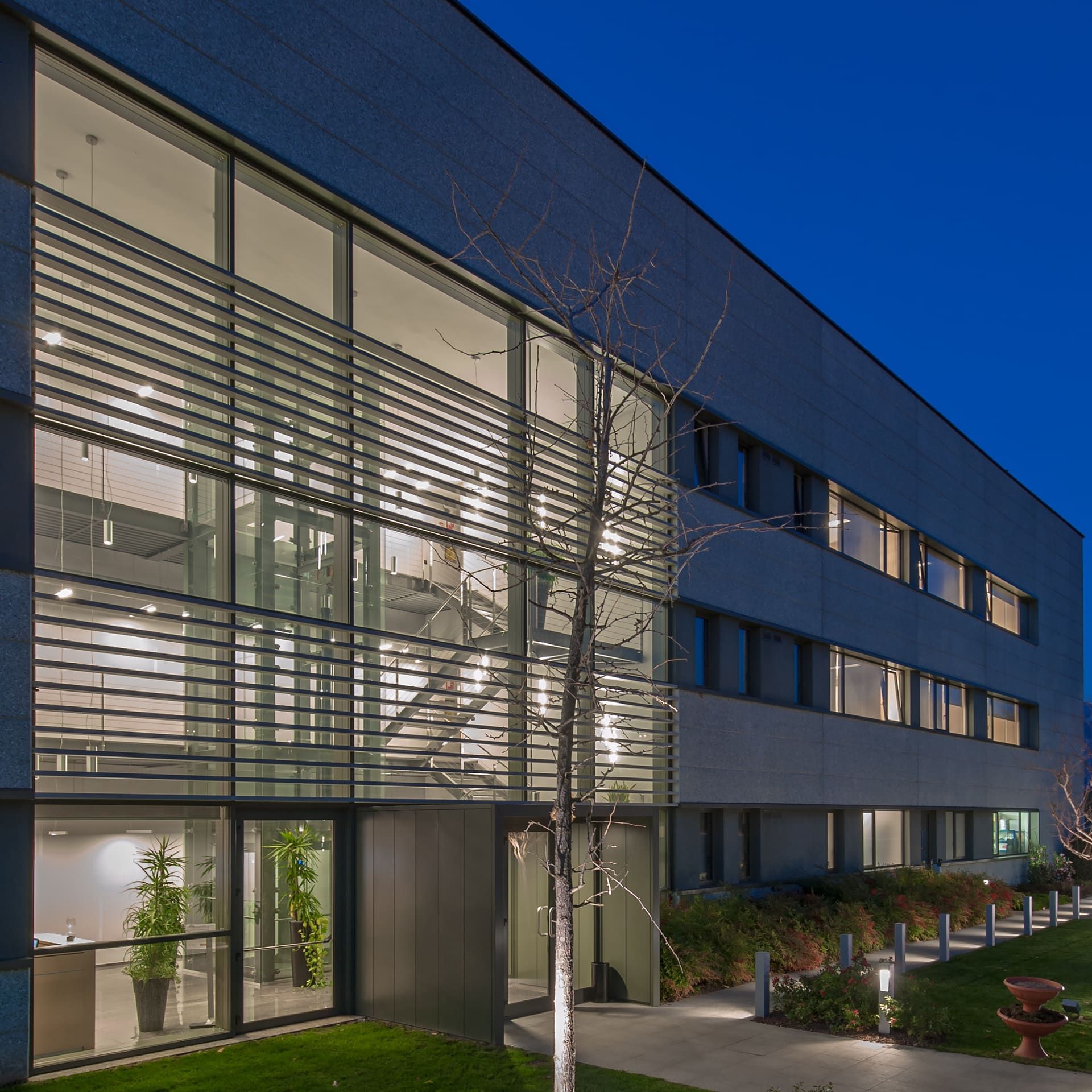 Le norme tecniche del piano attuativo imponevano, per le facciate, l’uso di pannelli prefabbricati in graniglia di cemento. Il disegno architettonico del fronte principale risponde ai vincoli normativi introducendo lunghi nastri orizzontali a cui corrispondono sottili brise soleil sovrapposti alla facciata continua dell’atrio di ingresso. Lo spazio centrale a tripla altezza organizza i sistemi distributivi, la sala riunioni e l’ufficio direzionale.